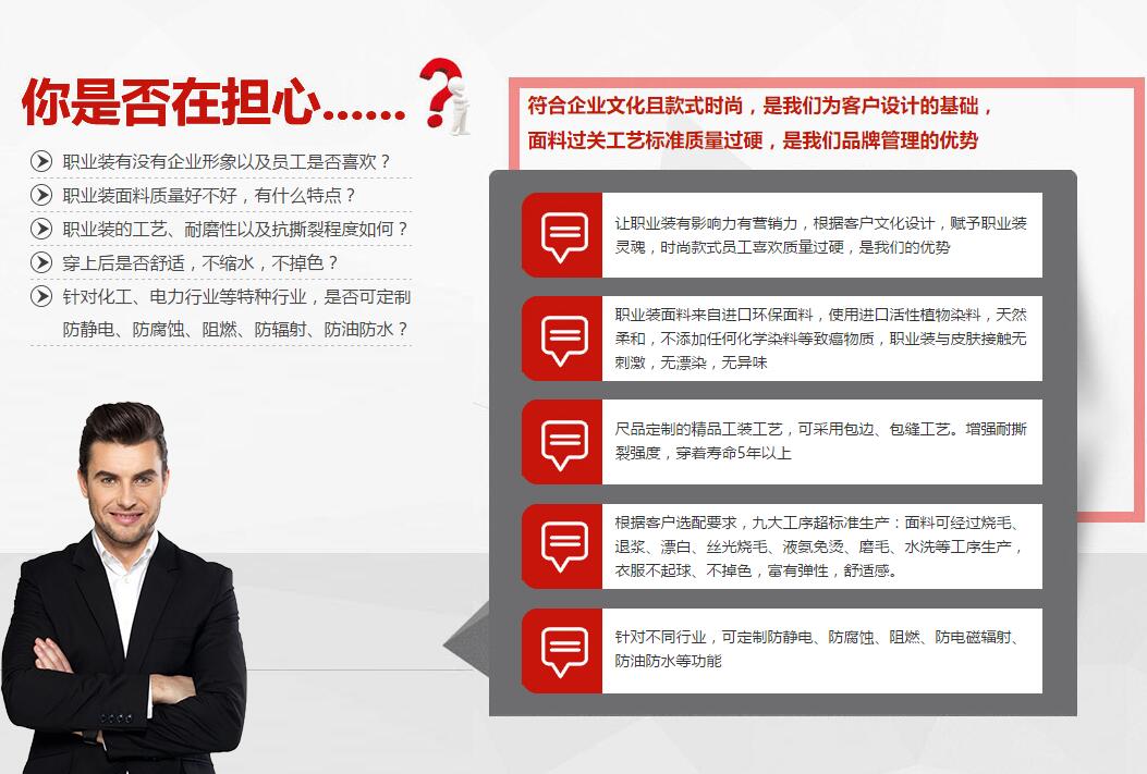 职业装面料来自天然环保面料,1000多种职业装面料选择,适用于多种场景及场合 针对不同行业的特种职业装可选防静电、防腐蚀、阻燃等功能